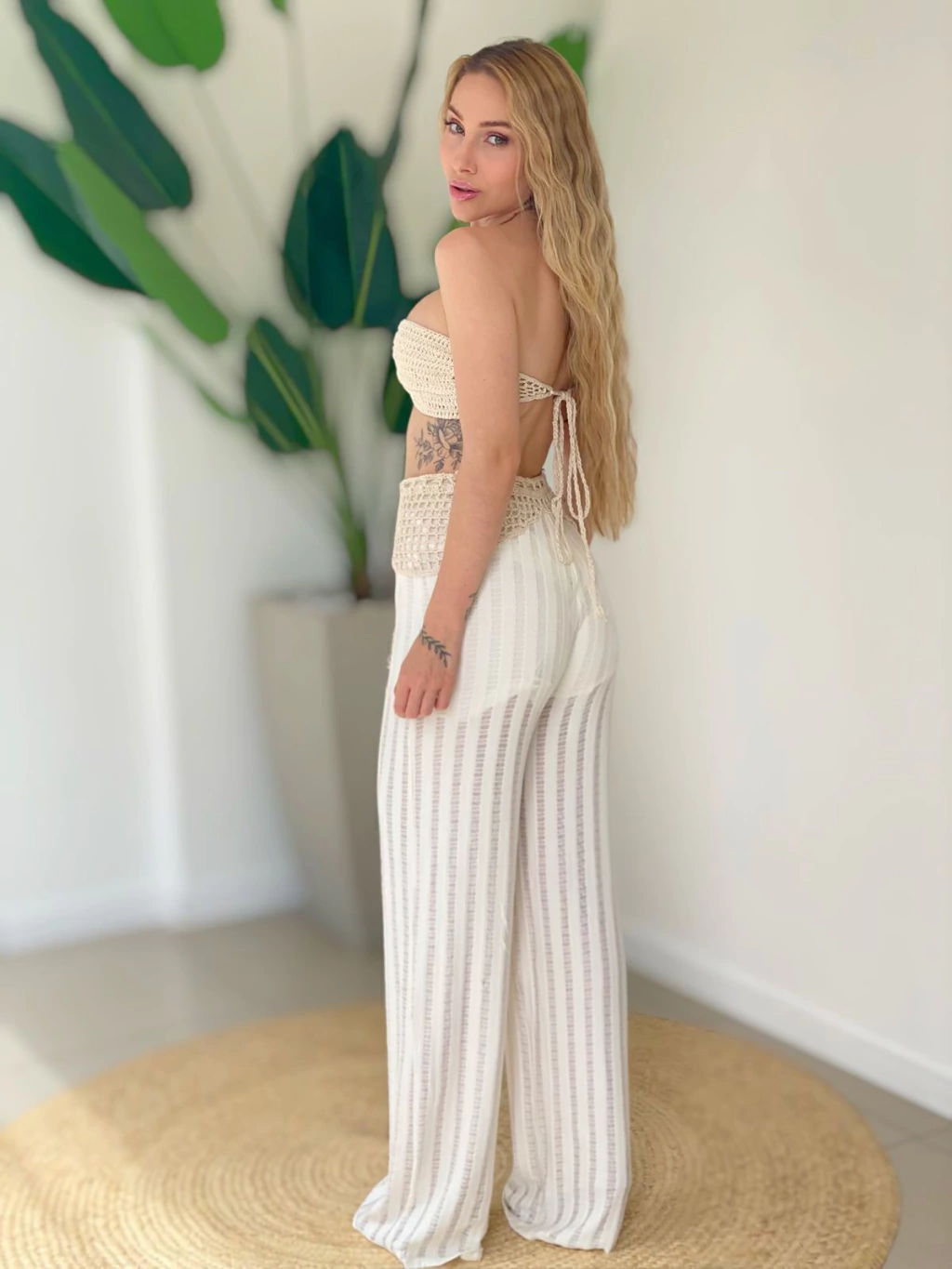O destaque fica por conta do top delicadamente adornado com detalhes em crochê, que trazem um toque artesanal e sofisticado à peça, elevando seu visual com um charme sutil e exclusivo. A harmoniosa união entre a calça e o top cria um conjunto versátil, perfeito para mulheres que apreciam moda com personalidade e bom gosto.